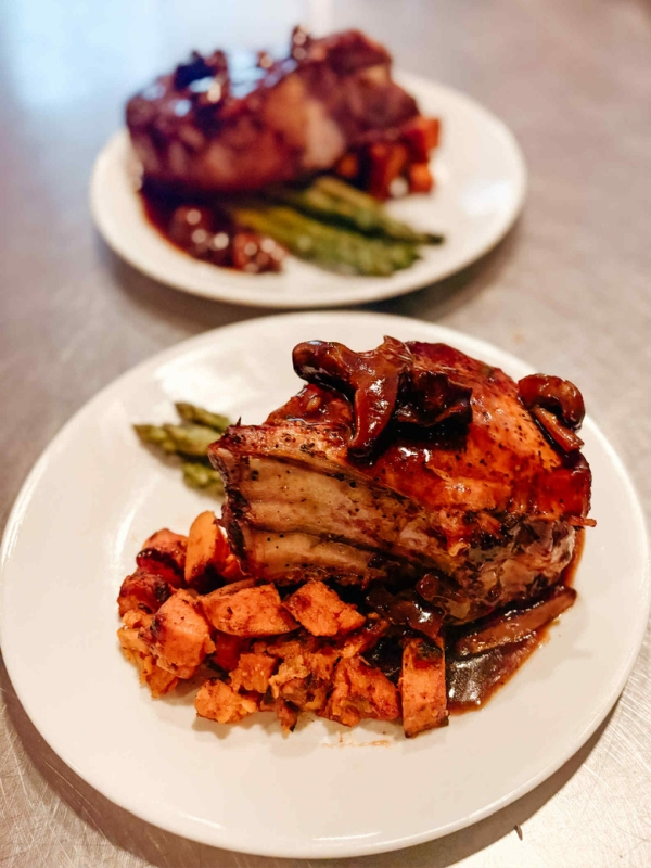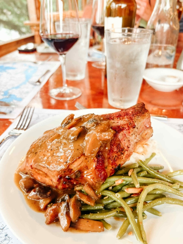 Although sides do vary the main course will be either Beef Tenderloin, BBQ baby back ribs, prime rib, strip loin steak, our famous 2 inch pork chop, or chicken. We do whole smoked pigs for corporate groups. Appetizers are delivered to the cabins regularly at 5 pm.